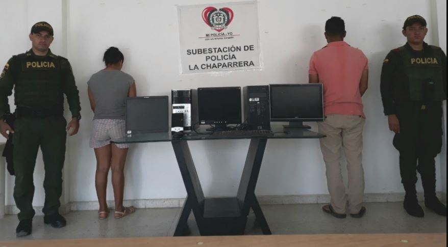 En medio de la acción policial, y gracias a la información de la comunidad, los sujetos, un hombre de 30 años y una mujer de 20, fueron interceptados en la escuela de la vereda Playón Santa Bárbara mientras se movilizaban en una motocicleta llevando consigo 2 CPU, 3 monitores, un mouse, un teclado y un parlante para computador.