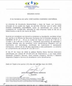 La empresa de Acueducto Alcantarillado y Aseo de Yopal, con domicilio principal en la ciudad de Yopal, se permite informar que el señor JOSE AUDÍAS CHAPARRO CASTAÑEDA, quien se identificaba con cédula de ciudadanía N° 74.858.209, laboraba en esta empresa hasta el día de su fallecimiento el día 01 de marzo de 2020.