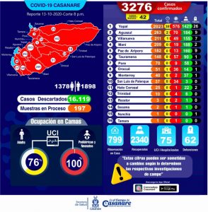 42 casos nuevos, y dos fallecidos más se registraron este 13 de octubre por el Coronavirus. Las víctimas mortales corresponden a un hombre de 40 años de Yopal y una mujer de 79 años de Aguazul.