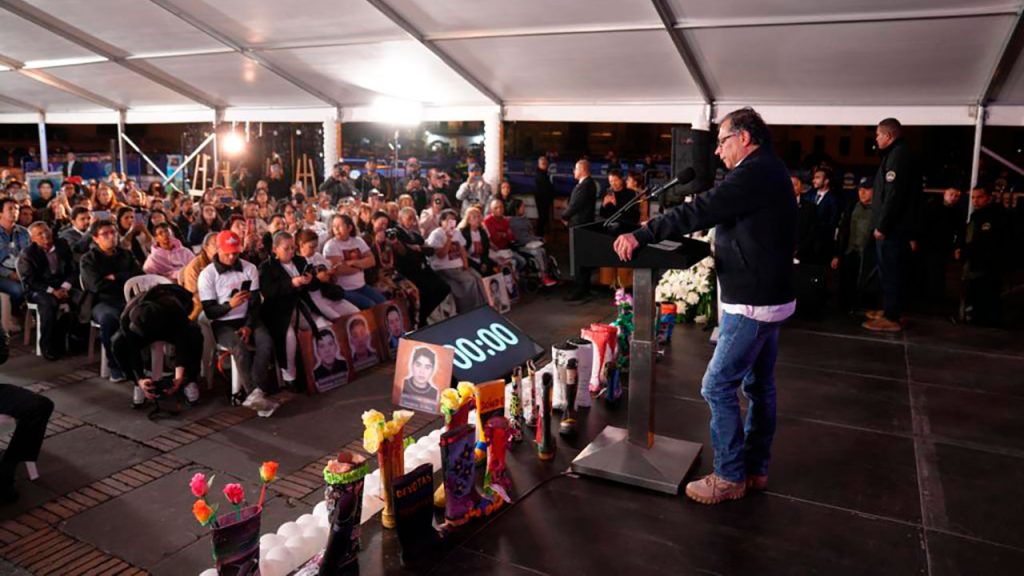El presidente Gustavo Petro reconoció con estas palabras la responsabilidad del Estado colombiano en los asesinatos de 19 jóvenes residentes en el municipio cundinamarqués de Soacha y en Bogotá, cometidos por miembros del Ejército Nacional entre los años 2004 y 2008, según consta en las decisiones judiciales que ordenaron efectuar un acto público de perdón y de responsabilidad por estos crímenes.