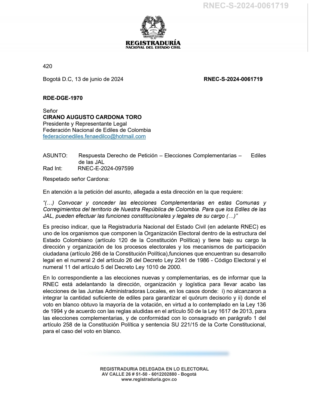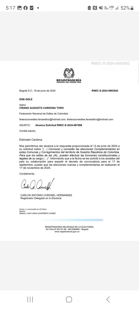 A petición de la Federación Nacional de Ediles de Colombia (FENAEDILCO), liderada por su presidente Cirano Cardona y el asesor jurídico Jhon Jairo Rondón, Olaya contactó al Registrador Nacional para solicitar la programación de elecciones complementarias. El resultado fue inmediato: se fijó el 17 de noviembre de 2024 como la fecha clave para la elección de nuevos ediles en zonas como Montería, donde la falta de representación es evidente.