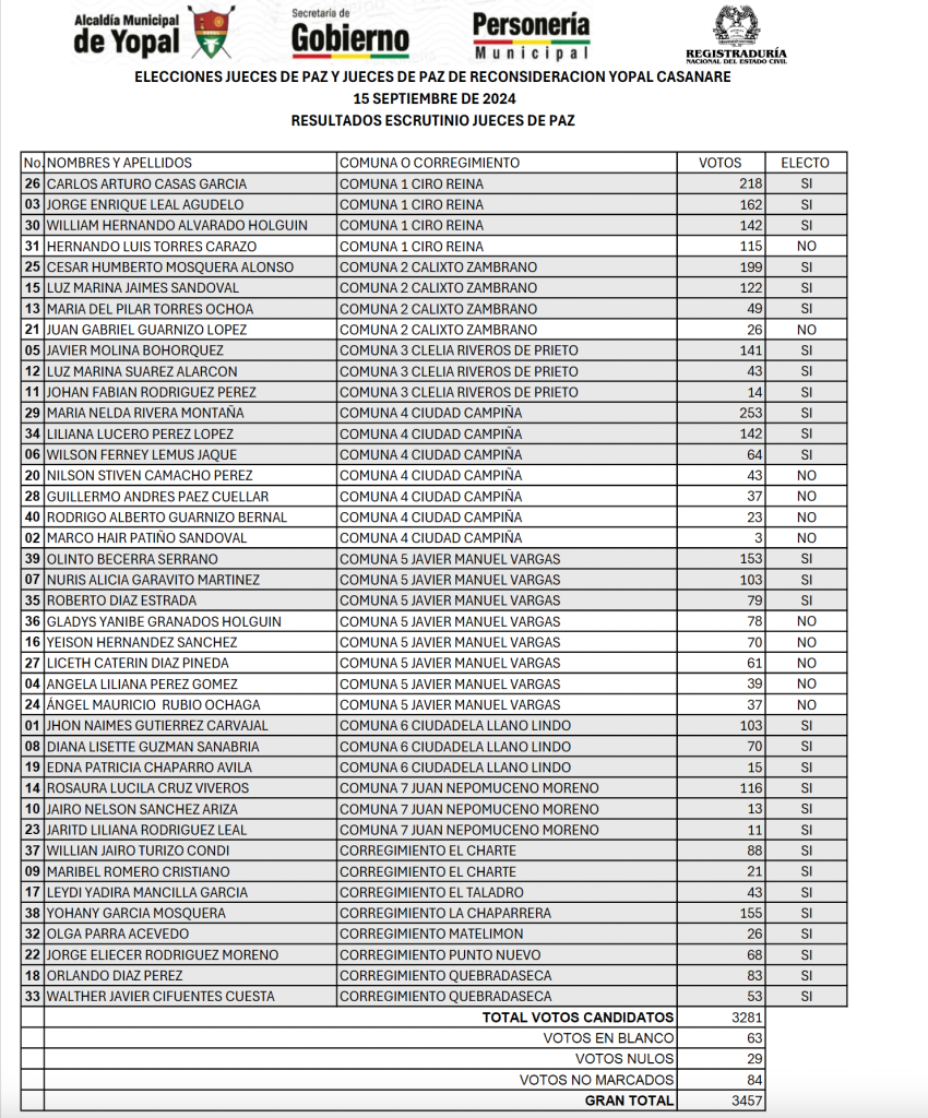 De los 57 candidatos inscritos, resultaron electas 45 personas, 29 jueces de paz y 17 jueces de reconsideración.