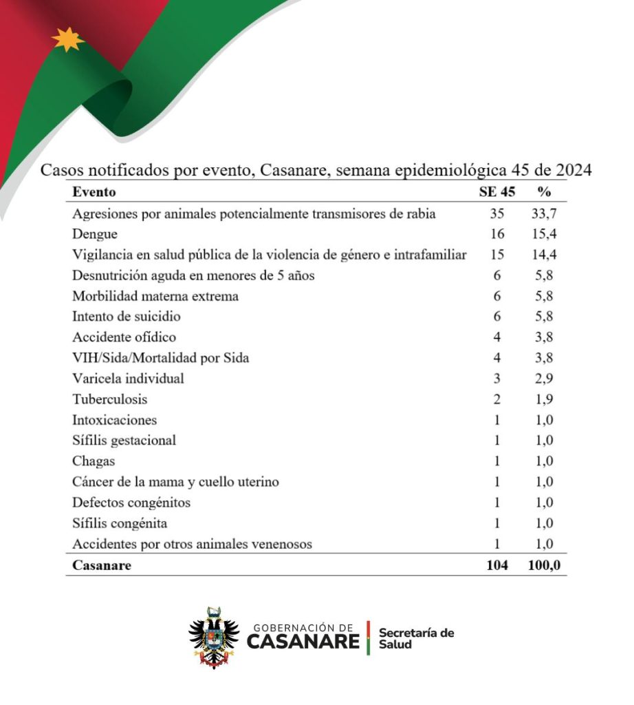 Como resultado de las acciones de vigilancia en salud pública, para la semana epidemiológica 45 de 2024, del total de 8.969 casos notificados, 104 (1,3%) fueron notificados durante esta semana, con los tres primeros lugares para los eventos de agresiones por animales potencialmente transmisores de rabia, dengue y violencia de género e intrafamiliar; y, fueron atendidas por consulta 566 personas, 374 (66,1%) por infección respiratoria aguda y 192 (33,9%) por enfermedad diarreica aguda (tabla 1) Casos notificados por evento, Casanare, semana epidemiológica 45 de 2024Evento SE 45 %Agresiones por animales potencialmente transmisores de rabia 35 33,7Dengue 16 15,4Vigilancia en salud pública de la violencia de género e intrafamiliar 15 14,4Desnutrición aguda en menores de 5 años 6 5,8Morbilidad materna extrema 6 5,8Intento de suicidio 6 5,8Accidente ofídico 4 3,8VIH/Sida/Mortalidad por Sida 4 3,8Varicela individual 3 2,9Tuberculosis 2 1,9Intoxicaciones 1 1,0Sífilis gestacional 1 1,0Chagas 1 1,0Cáncer de la mama y cuello uterino 1 1,0Defectos congénitos 1 1,0Sífilis congénita 1 1,0Accidentes por otros animales venenosos 1 1,0Casanare 104 100,0Día mundial de la diabetes: En la semana 45 también se conmemoró el Día Mundial de la Diabetes, un recordatorio importante sobre la lucha global contra esta enfermedad. En 1991 la Organización Mundial de la Salud y la Federación Internacional de la Diabetes, crearon el Dia Mundial de la Diabetes (DMD) a celebrar el 14 de noviembre de cada año, en conmemoración del aniversario del nacimiento de Sir Frederick Banting, quien, en 1922, junto con Charles Best, descubrió la insulina; y, mediante Resolución 61/225 de 2026 se convirtió en un día oficial de las Naciones Unidades, un paso más en la contribución del Objetivo de Salud y Bienestar de la Agenda 2030 para el Desarrollo Sostenible, que reclama que se garantice una vida sana para todos en todas las edades.Según la Organización Mundial de la Salud (OMS), la diabetes es una enfermedad crónica que se presenta cuando el páncreas no produce la suficiente la hormona denominada insulina que regula la concentración de glucosa en la sangre, es decir, la glucemia, o cuando el organismo no utiliza eficazmente la insulina que produce. Según el tipo de diabetes, la diabetes tipo 1, conocida como diabetes insulinodependiente, juvenil o de inicio en la infancia, se caracteriza por una producción deficiente de insulina y requiere la administración diaria de esta hormona; la diabetes tipo 2, afecta la forma en que el cuerpo usa el azúcar (glucosa) para obtener energía, impidiendo que use la insulina adecuadamente, lo que puede aumentar las concentraciones de azúcar en la sangre si no se trata y con el tiempo causar daños graves al organismo y cuyos síntomas pueden ocurrir repentinamente, entre ellos, sensación de sed, necesidad de orinar con más frecuencia de lo habitual, visión borrosa, cansancio y perder peso sin querer.Finalmente, la diabetes gestacional aparece durante el embarazo y se caracteriza por una hiperglucemia con valores que, pese a ser superiores a los normales, son inferiores a los establecidos para diagnosticar diabetes, las gestantes que la presentan tienen más riesgo de sufrir complicaciones durante el embarazo o el parto; y, que tanto la madre como posiblemente sus hijos corren más riesgo de presentar diabetes tipo 2 en el futuro.Es así como, la Secretaría de Salud se une a la conmemoración de Día Mundial de la Diabetes, y recuerda a la comunidad que, de acuerdo con la OMS, la mejor manera de prevenir o retrasar eficazmente la aparición de la diabetes de tipo 2 es cambiar de hábitos, alcanzar y mantener un peso corporal saludable, mantenerse físicamente activo con al menos 30 minutos de ejercicio moderado cada día, seguir un régimen alimentario saludable, sin azúcar ni grasas saturadas y no fuma tabaco.