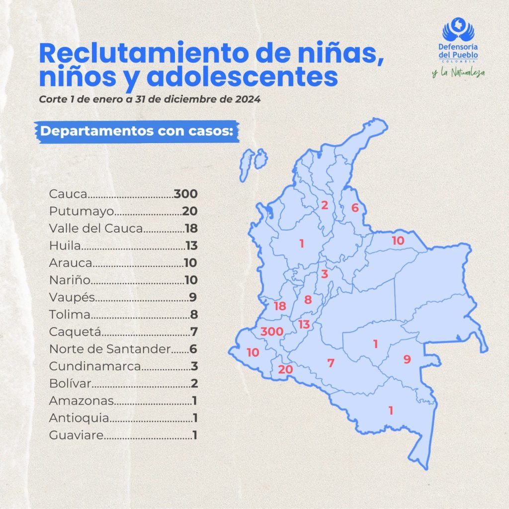 El informe detalla que en todo el país fueron reportados 409 casos de reclutamiento de niños, niñas y adolescentes, de los cuales 300 ocurrieron en el departamento del Cauca, convirtiéndolo en la región con mayor incidencia. De acuerdo con Iris Marín, Defensora del Pueblo, el año 2024 cerró con una cifra preocupante de 342 menores reclutados, aunque las cifras varían según las regiones y las dificultades para que las víctimas denuncien por miedo a represalias.De los menores reclutados en el país, un 57% pertenecían a comunidades étnicas.