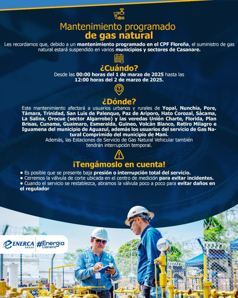 La empresa ENERCA S.A. E.S.P. ha anunciado un mantenimiento programado en las instalaciones del CPF Floreña, el cual afectará el suministro de gas natural en diversas zonas desde las 00:00 horas del 1 de marzo hasta las 12:00 horas del 2 de marzo de 2025. Durante este período, se podrán experimentar bajas presiones o incluso interrupciones en el servicio de gas natural en varios municipios y veredas de la región.Además, los usuarios que dependen del Gas Natural Comprimido (GNC) y las estaciones de servicio de GNV también se verán impactados por esta suspensión temporal.