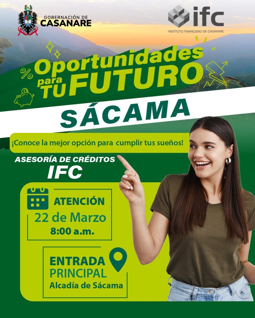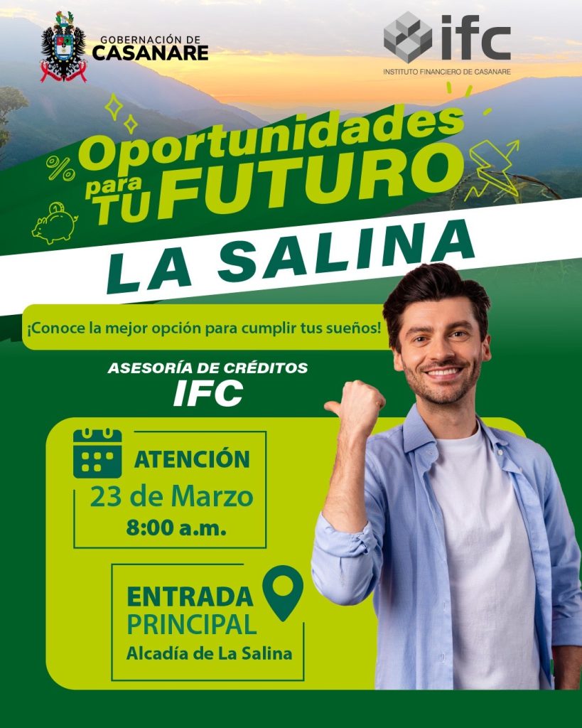 A partir de las 8:00 am en la entrada principal de las Alcaldías de Sácama (22 de marzo), y de La Salina (23 de marzo), profesionales del IFC, en cabeza de la subgerente Comercial y de Crédito, Kelly Jhoana Estrada Buitrago, darán a conocer las diferentes líneas de crédito: Ecucativo, Comercial y Agropecuario.
