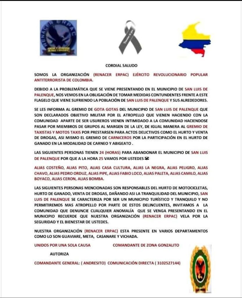 El hecho ocurre pocos días después de que circulara un panfleto atribuido al grupo Renacer ERPAC, en el que advertían ataques contra personas vinculadas con el cobro de préstamos ilegales en esta zona del departamento.