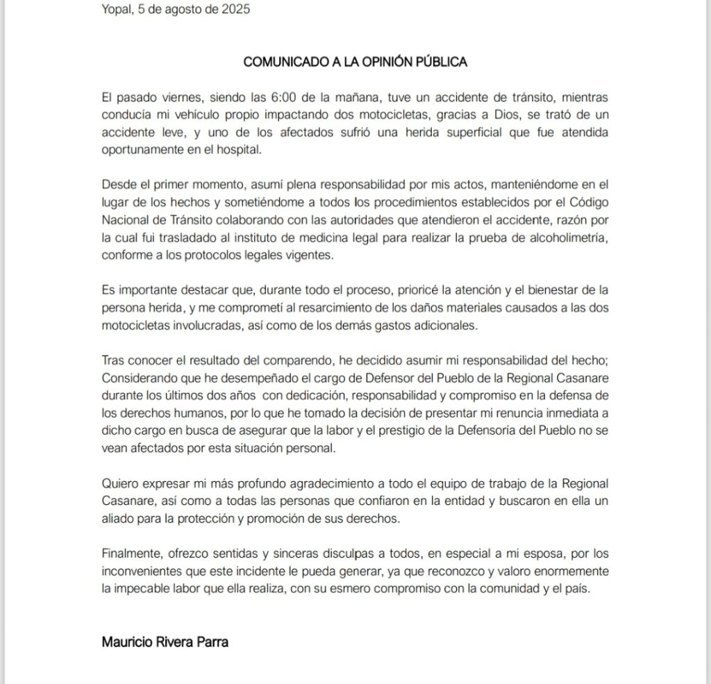 El hasta hoy Defensor del Pueblo en Casanare, Mauricio Rivera Parra, presentó su renuncia irrevocable al cargo luego de verse involucrado en un accidente de tránsito ocurrido el pasado viernes 1 de agosto en Yopal, en el que impactó a dos motociclistas mientras conducía su vehículo particular a las 6:00 a.m.