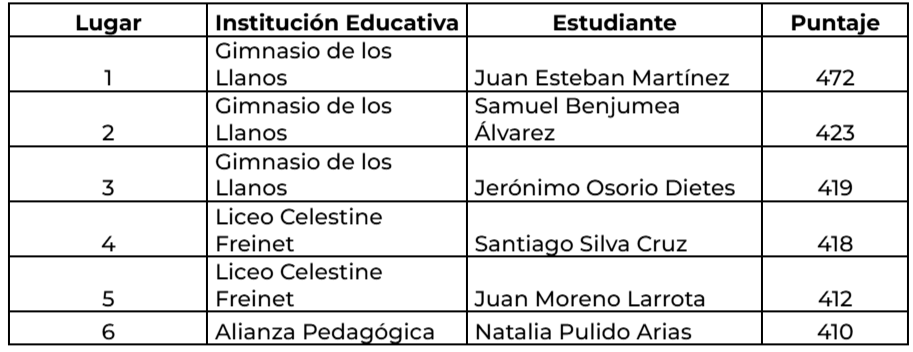 Falta David Santiago Meneses Quintana del Gimnasio Thomas Jefferson con 415 puntos.