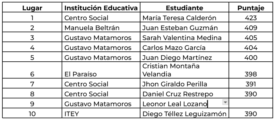 Mientras que en 2023 el mejor puntaje fue de 387 puntos, este año la estudiante María Teresa Calderón, del Centro Social, alcanzó 423 puntos, es decir, 36 puntos más.El segundo lugar fue para Juan Esteban Guzmán, de la institución Manuela Beltrán, con 409 puntos.