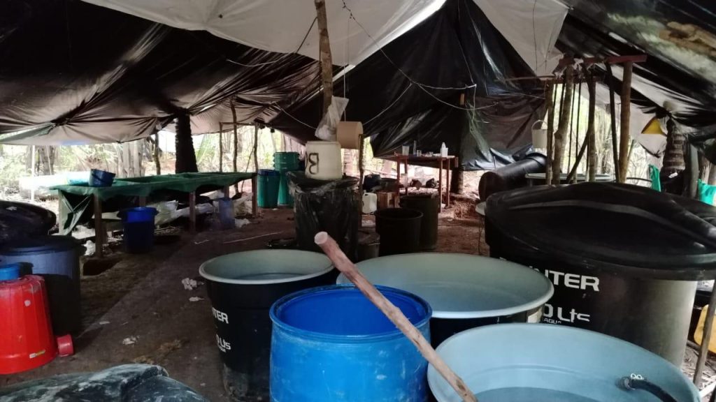 El complejo ilegal estaba compuesto por nueve construcciones levantadas en madera y plástico, equipadas para alojar hasta 15 personas y con espacios destinados a cocina, almacenamiento de insumos, secado y empaque.