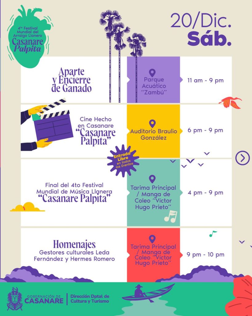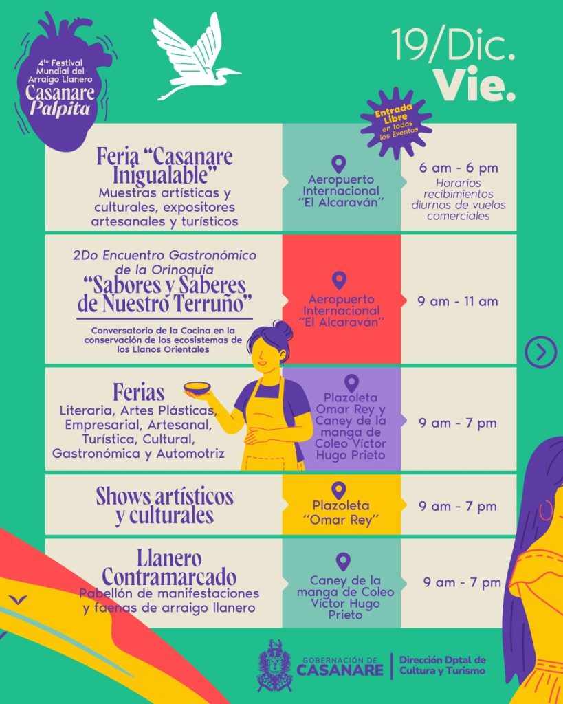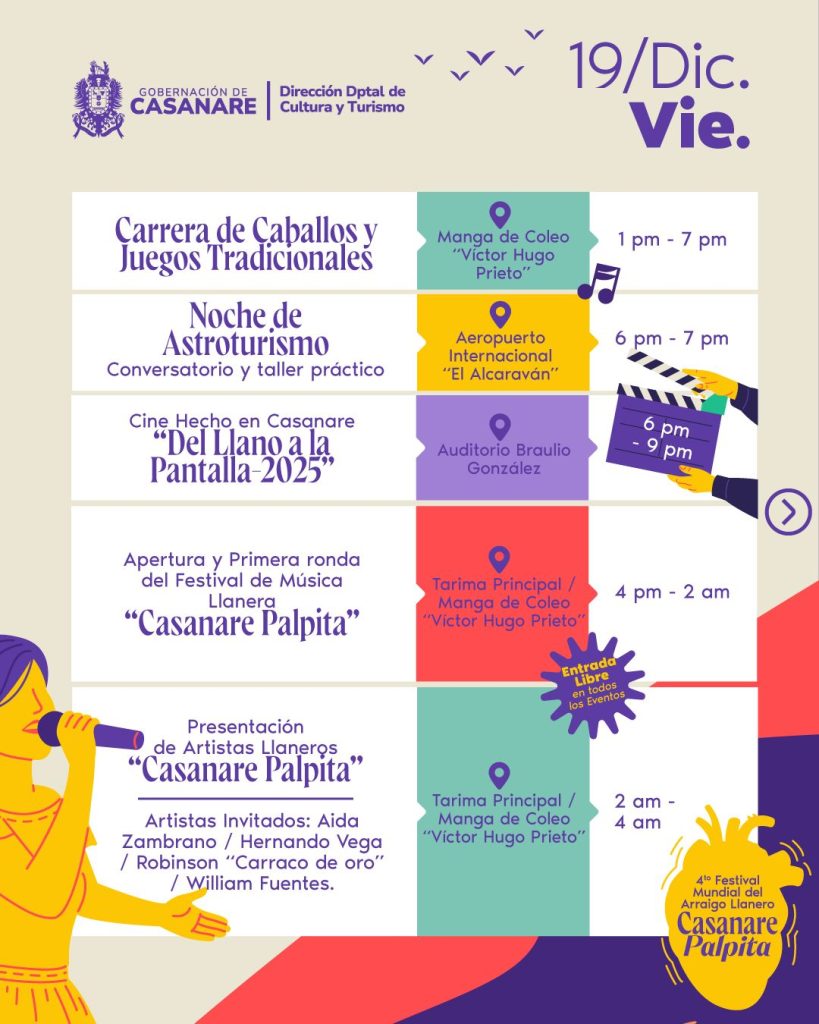 El viernes 19 de diciembre estará marcado por las ferias multisectoriales, el Segundo Encuentro Gastronómico de la Orinoquía, muestras artísticas y culturales, cine hecho en Casanare, actividades de arraigo llanero y la apertura oficial del Festival de Música Llanera Casanare Palpita, con su primera ronda y presentaciones de reconocidos artistas del género.