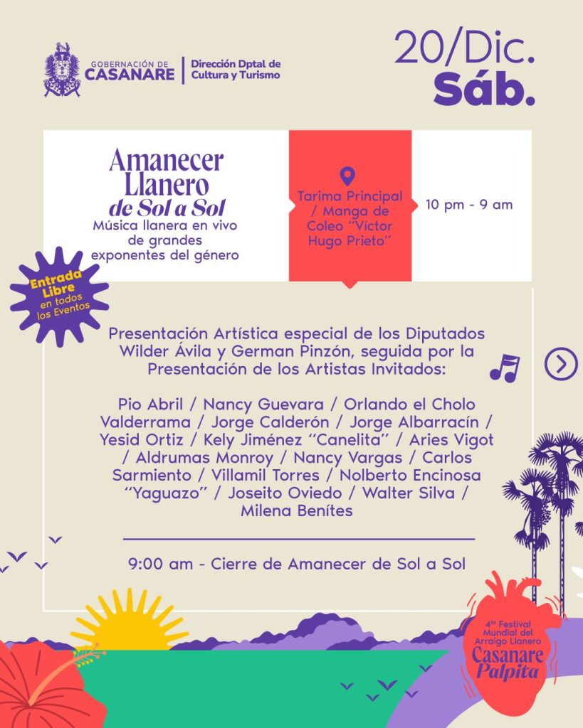 Para el sábado 20 de diciembre, la agenda sube de intensidad con ferias, cantos de trabajo de llano, coleo campesino, encuentros gastronómicos, actividades ganaderas y la esperada final del Festival Mundial de Música Llanera. La jornada cerrará con homenajes a gestores culturales y el tradicional Amanecer Llanero de Sol a Sol, una maratón musical que se extenderá durante la noche y la madrugada.
