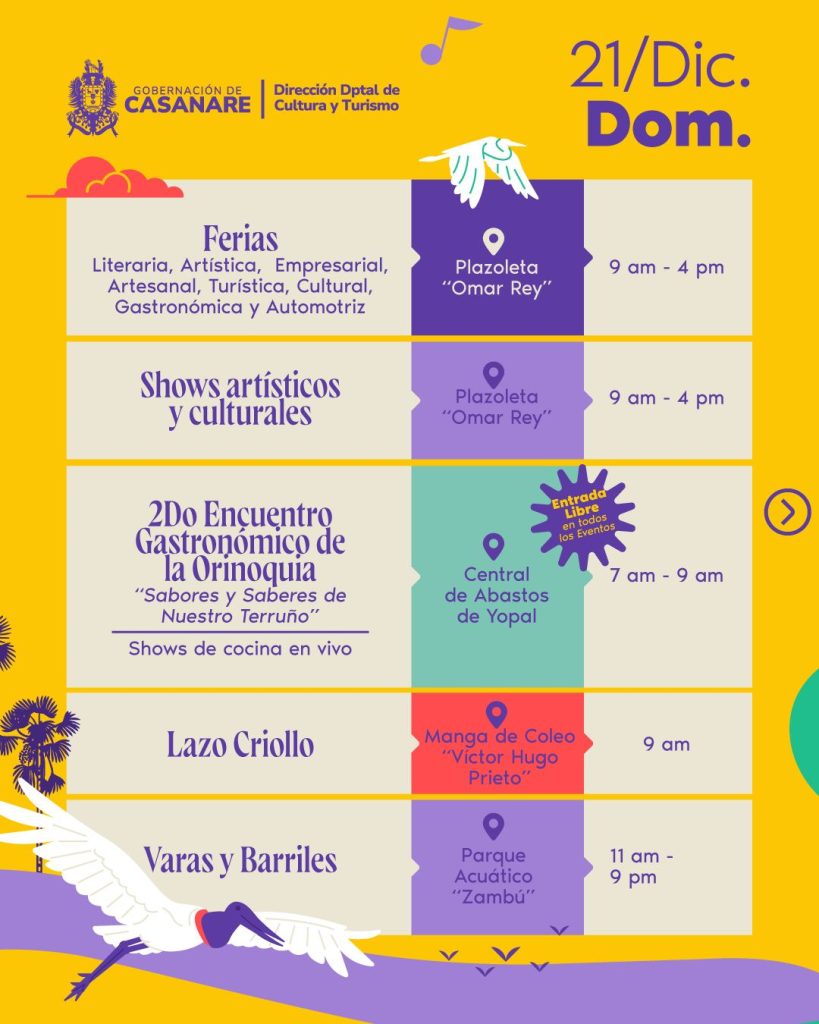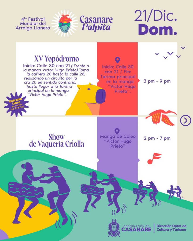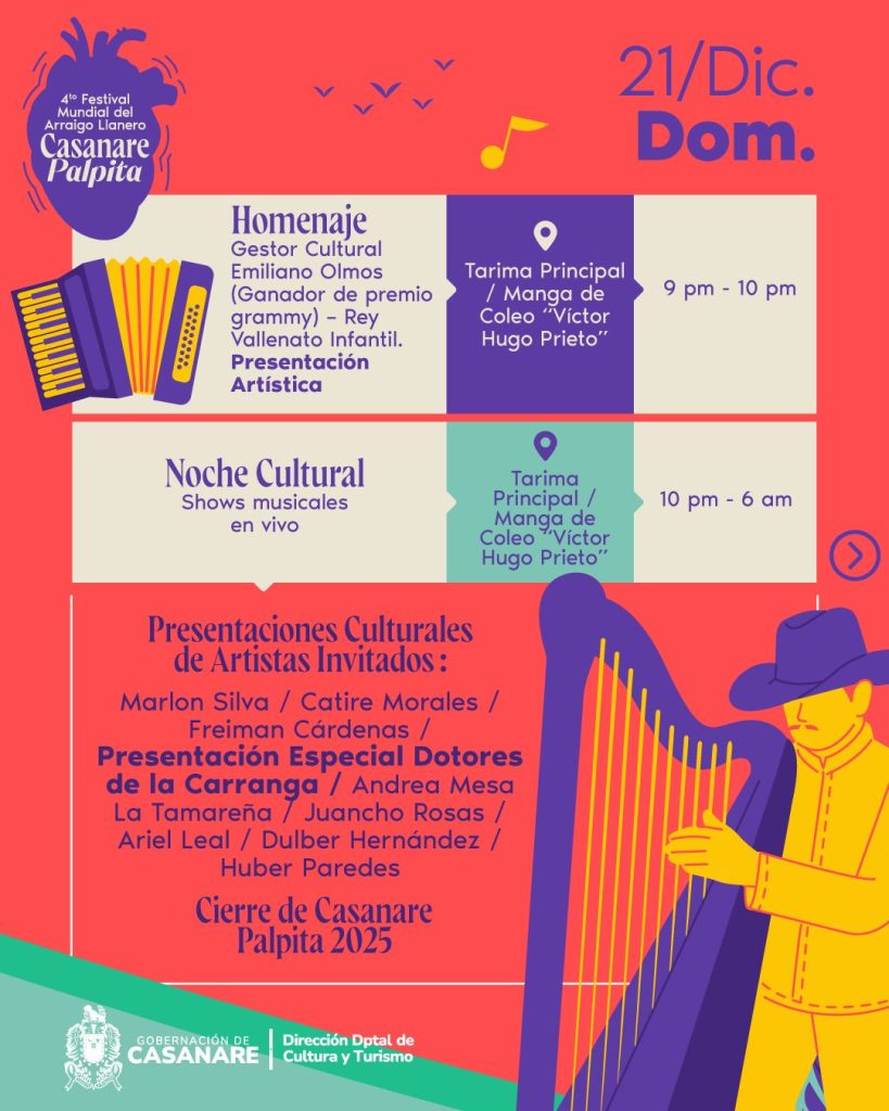 El cierre del festival será el domingo 21 de diciembre, con ferias, shows culturales, encuentros gastronómicos y actividades tradicionales como varas y barriles, Yopódromo en su versión número XV, lazo criollo, homenajes culturales y la Noche Cultural, que pondrá el broche de oro a Casanare Palpita 2025.