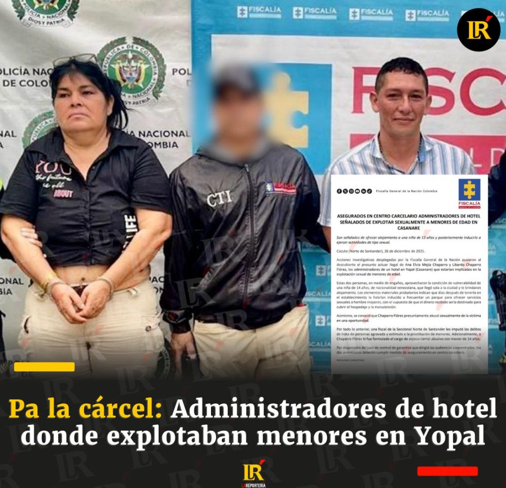 Ana Elvia Mejía y Libardo Chaparro, administradores de un hotel en #Yopal, son señalados de ofrecer alojamiento a una niña de 14 años y posteriormente inducirla a ejercer actividades de tipo sexual.