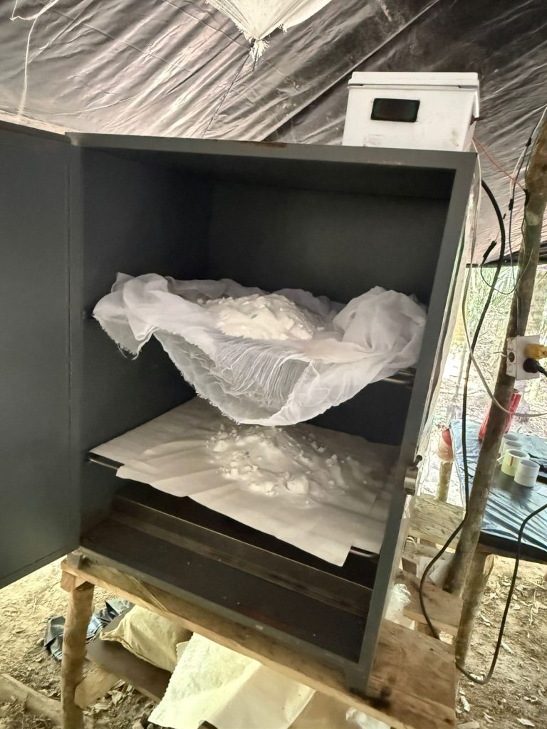 En el complejo ilegal también fueron inutilizados generadores eléctricos, prensas hidráulicas, hornos microondas, empacadoras al vacío, secadoras, filtros, tanques, moldes con la marquilla “MELIZA” y otros equipos industriales empleados en la cadena de producción del narcotráfico.