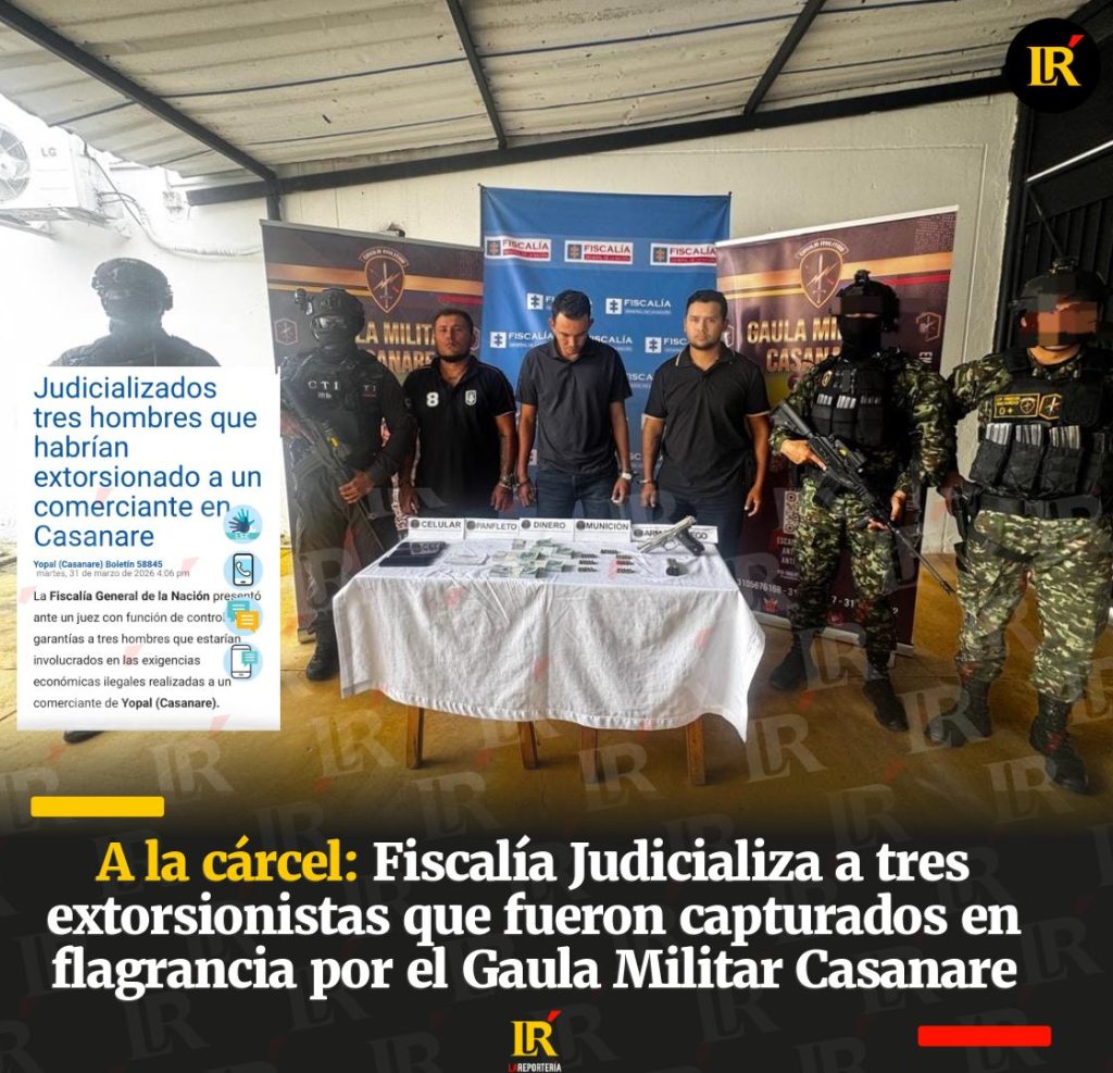 La Fiscalía General de la Nación judicializó a tres hombres señalados de extorsionar a un comerciante en Yopal, en un caso que fue frustrado gracias a una operación en flagrancia del Gaula Militar Casanare en coordinación con el CTI.